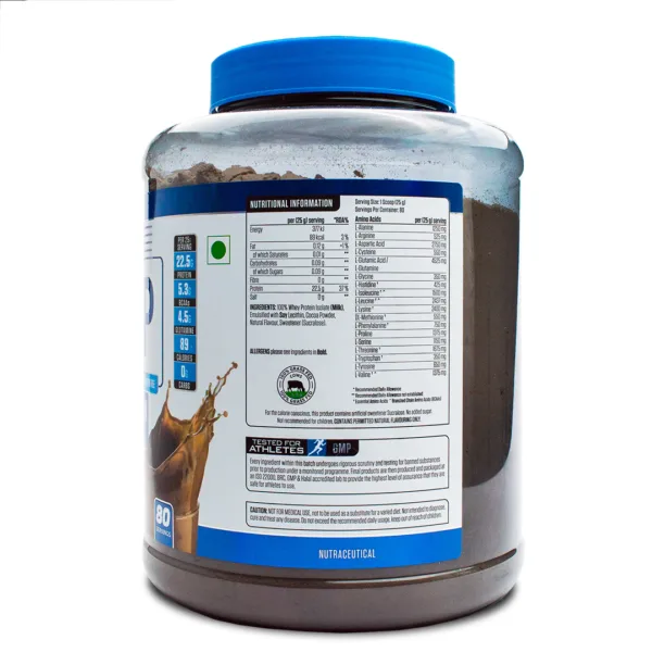 100% Whey Protein Isolate (Milk) (Emulsified with Sunflower Lecithin), Cocoa Powder, Natural Flavour, Sweetener (Sucralose).