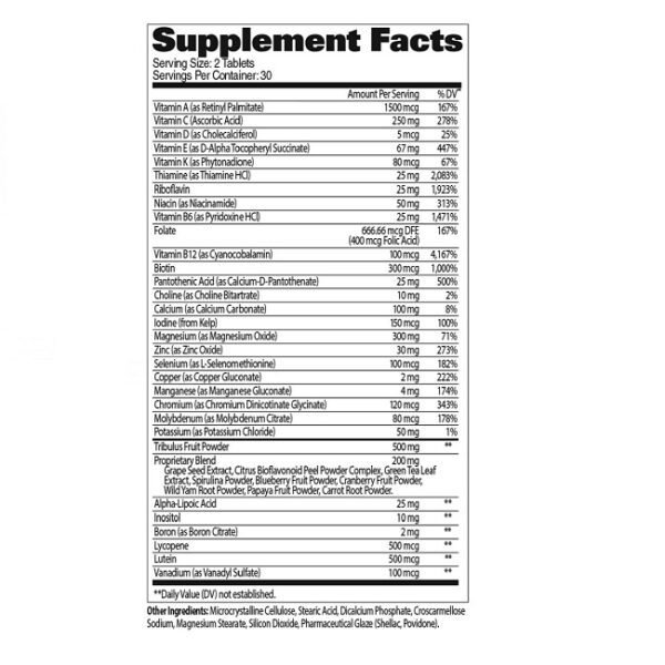 Men’s multi plus test is a complete vitamin, mineral and energy multivitamin with added men’s virility ingredient tribulus terristis. Men’s multi plus test offers athletes solid support for nutrient deficiencies they may need with an added testosterone support.