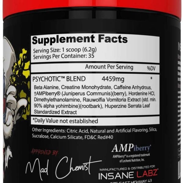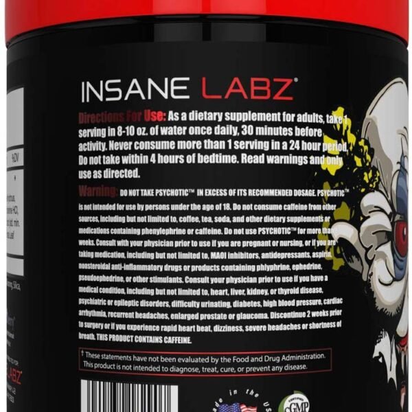 Mix one scoop of Insane Labs Psychotic Pre-workout with 6 to 8 ounces of water and consume 20 to 30 minutes before your workout. Start with half a scoop to assess your tolerance, and do not exceed one scoop per day.