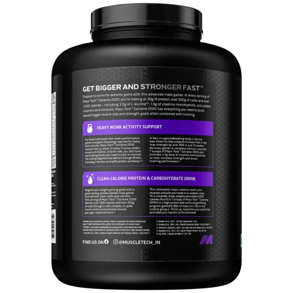 In fact, in a ground-breaking study, L-leucine was shown to help subjects increase their 5-rep max strength by over 40% in just 12 weeks5. No mass gainer is complete without creatine! 7 scoops of Mass-TechTM Extreme 2000 also include a 3g dose of creatine to help increase strength and boost training performance2.