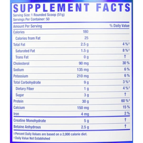 Protein Complex (Whey protein concenterte, Milk portein isolate, calcium caseinate, whey protein isolate, Micellar casein) Creatine Monohydrate, Betaine.